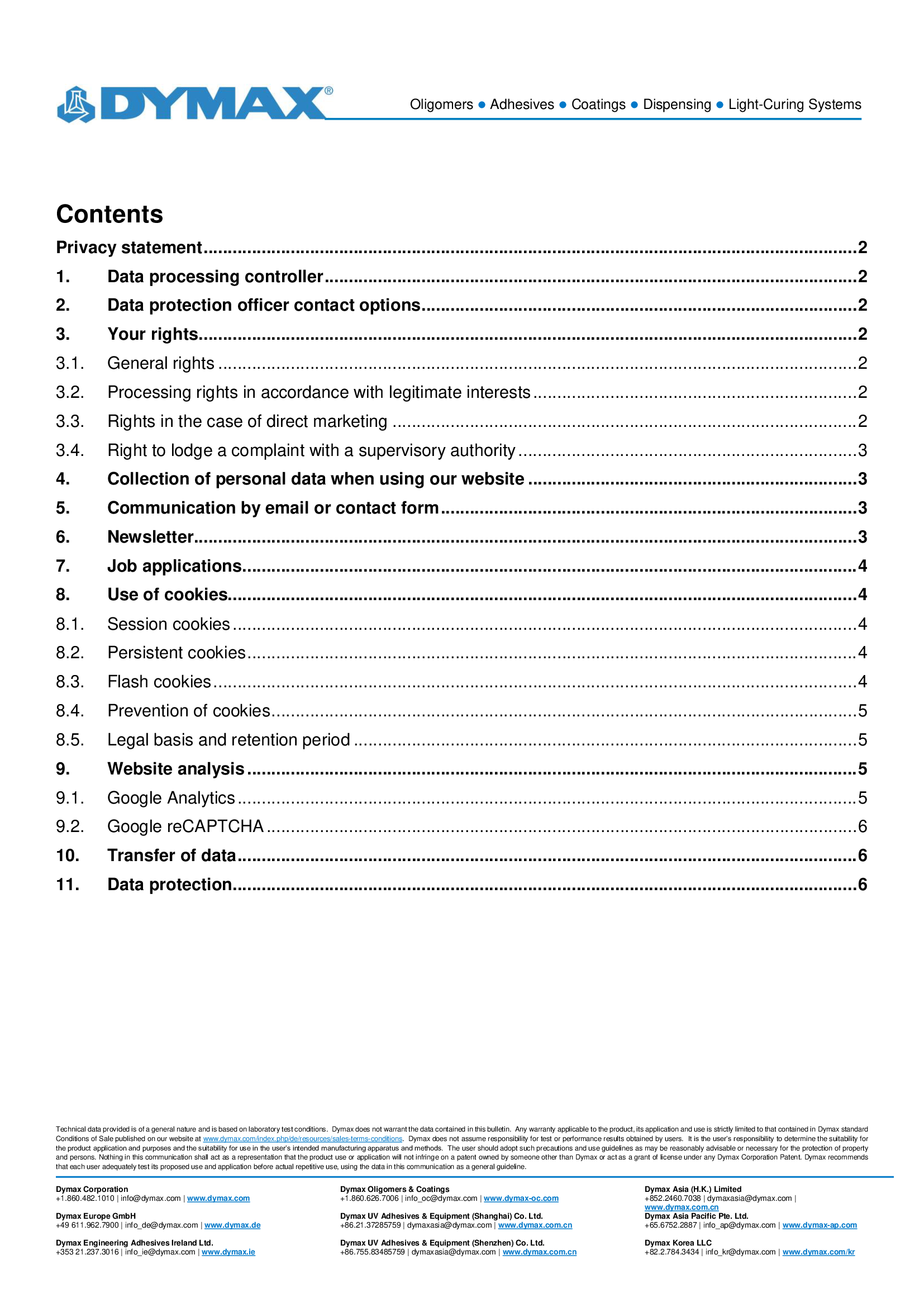 Controller in accordance with Art. 4 (7) EU General Data Protection Regulation (GDPR) is Dymax Corporation 318 Industrial Lane / Torrington, CT 06790, Email: info@dymax.com (if not mentioned separately in imprint).